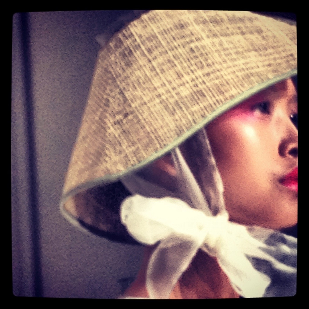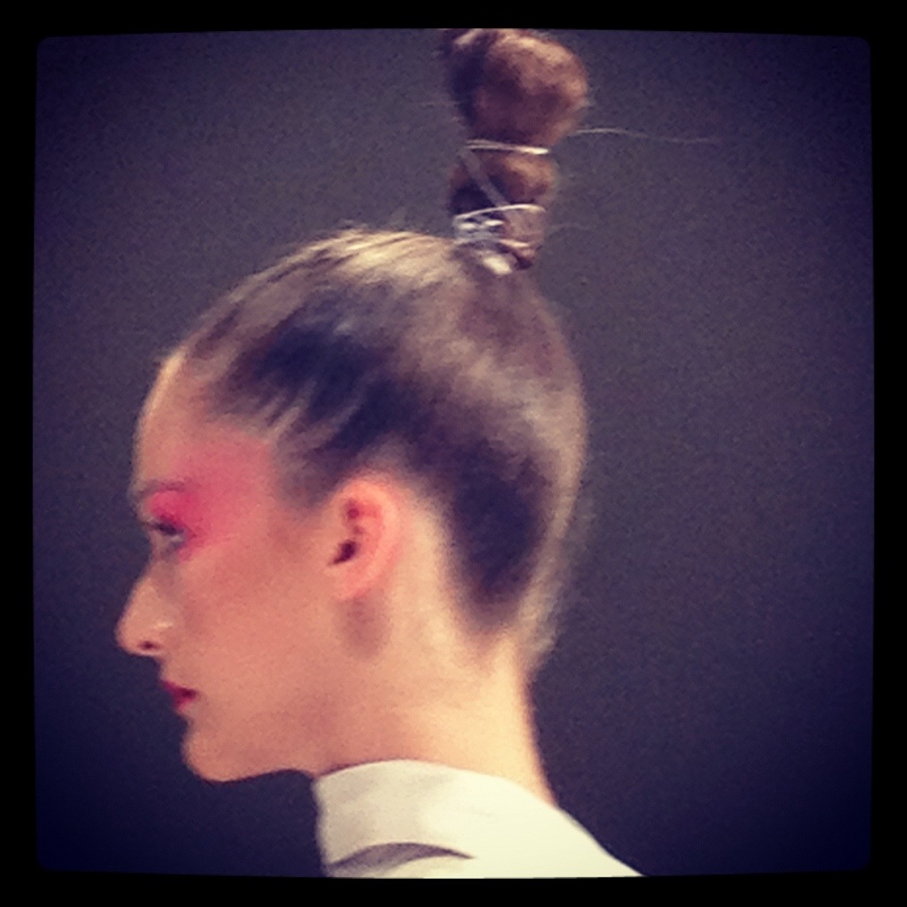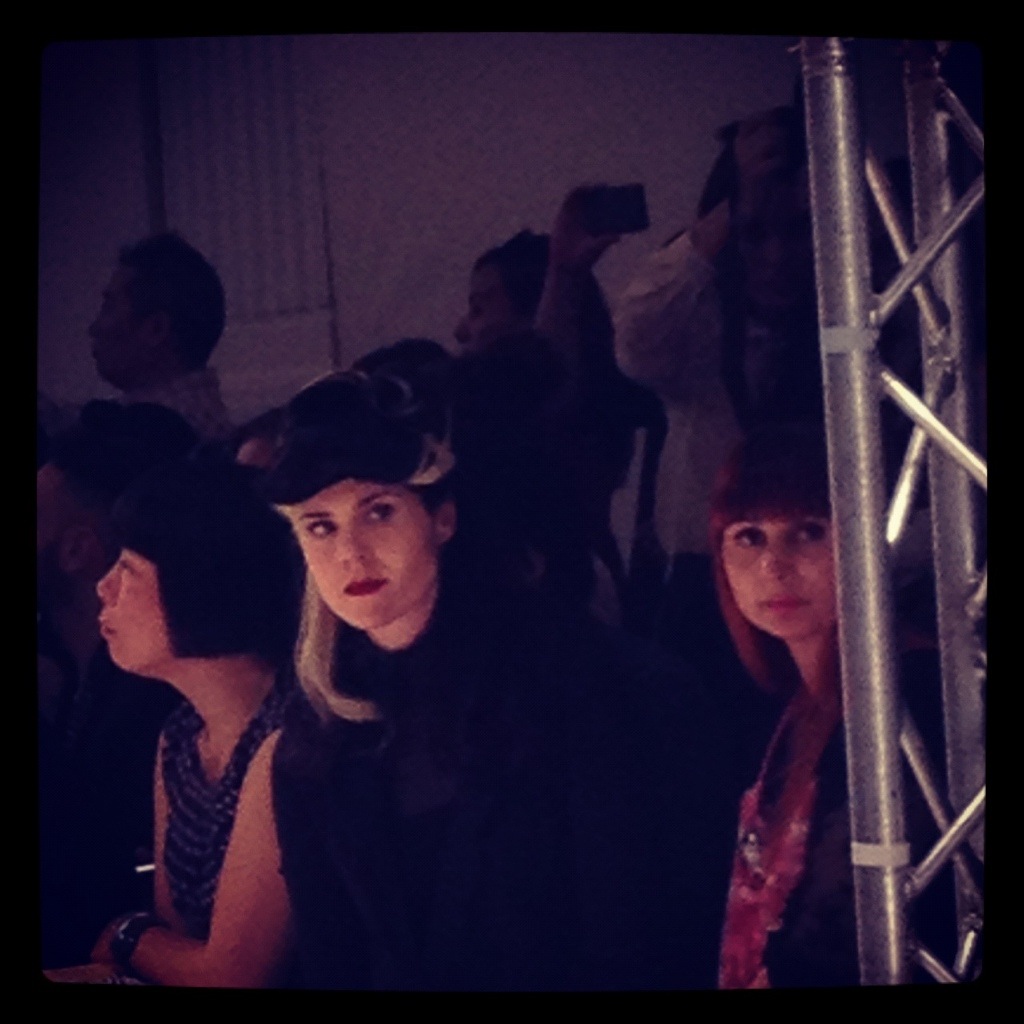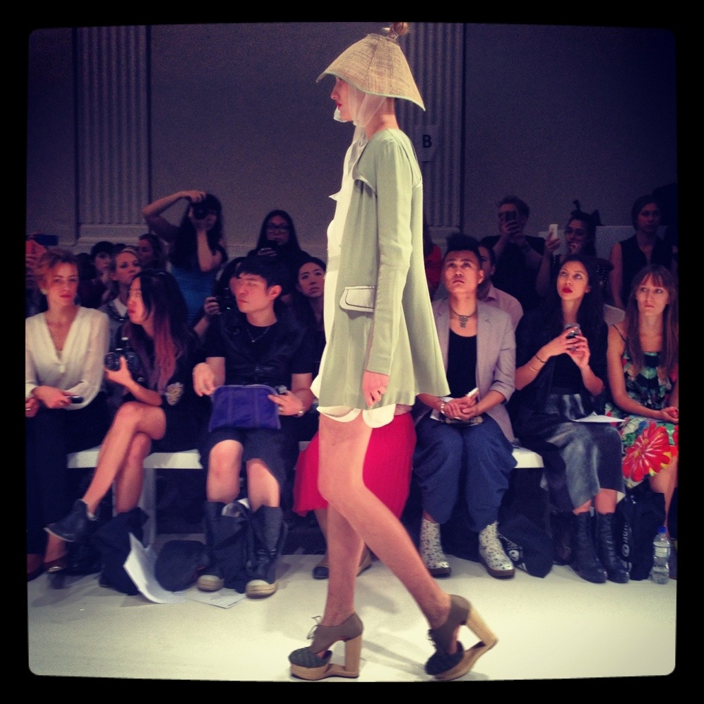 Opposite us on the tea lined catwalk was Kate Nash who was sporting a Daphne Guinness style black and white hair colour. Ji Cheng’s collection was inspired by Chinese tea rituals and used a predominantly white, nude and mint green palette. Perfect styling included wooden platforms and a modern take on traditional peasant hats .