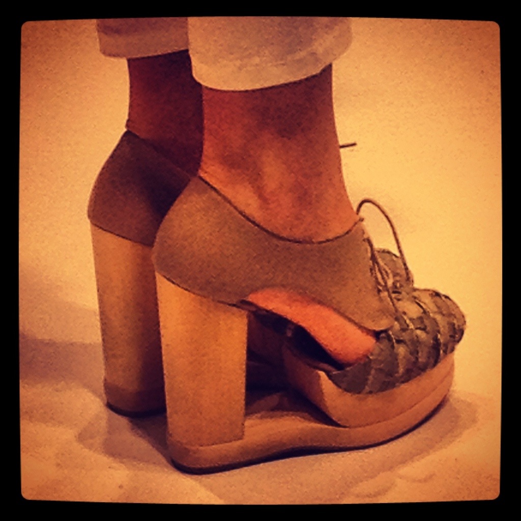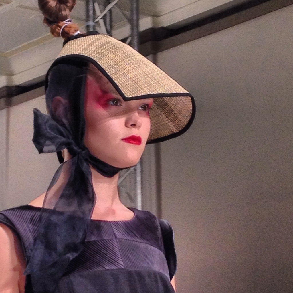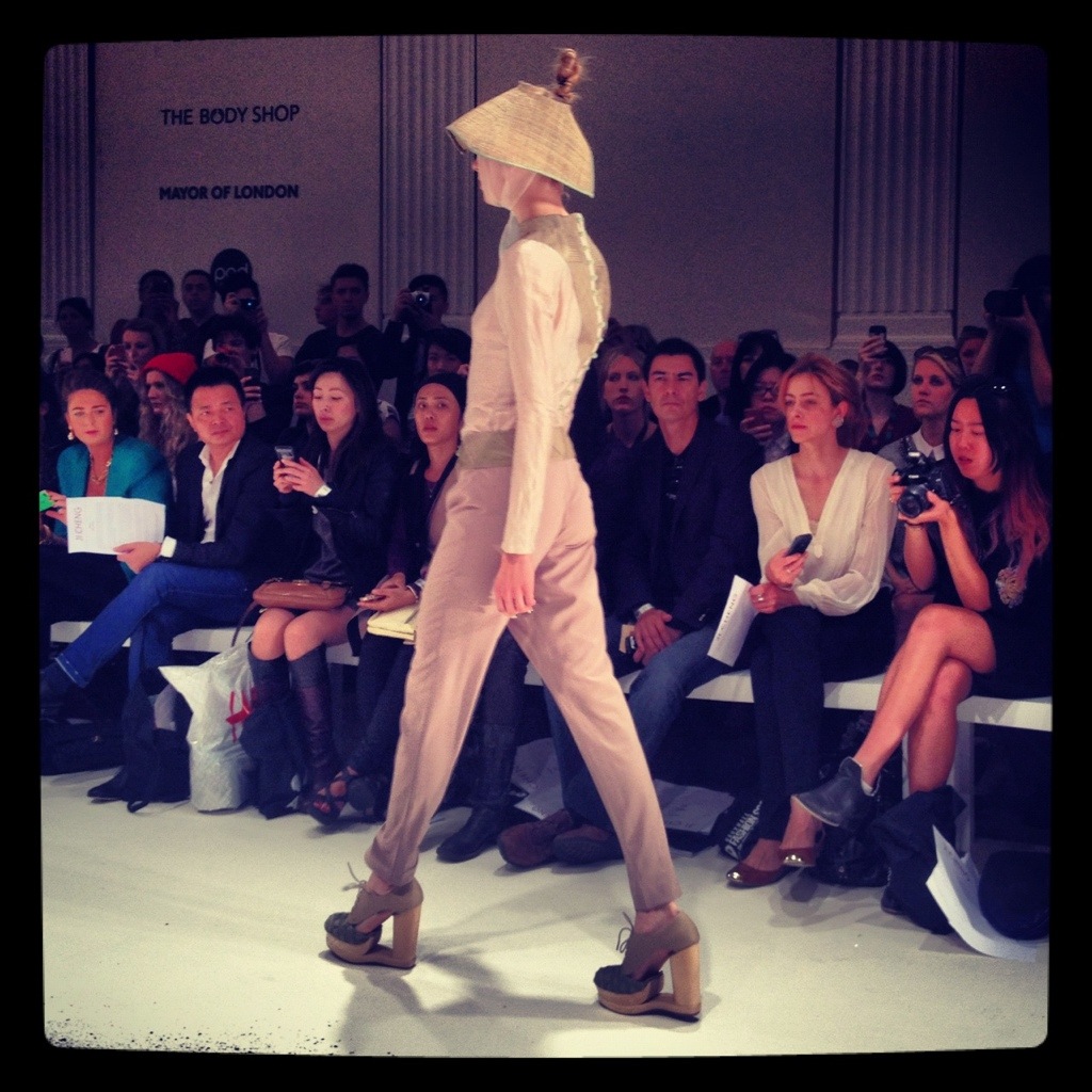 Saturday dawned brightly, a beautiful sunny start to a weekend of Fashion. The Daks show started just as brightly with white washed dresses followed by apricot and rust coloured jumpsuits and the occasional Burberry reminiscent check. My first celebrity spotting of the day was Absolutely Fabulous’ Joanna Lumley suitably styled with a ridiculous hat. There was time for copious amounts of coffee before the Ji Cheng show at Vauxhall Fashion Scout.