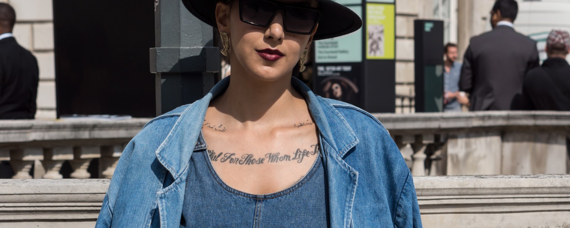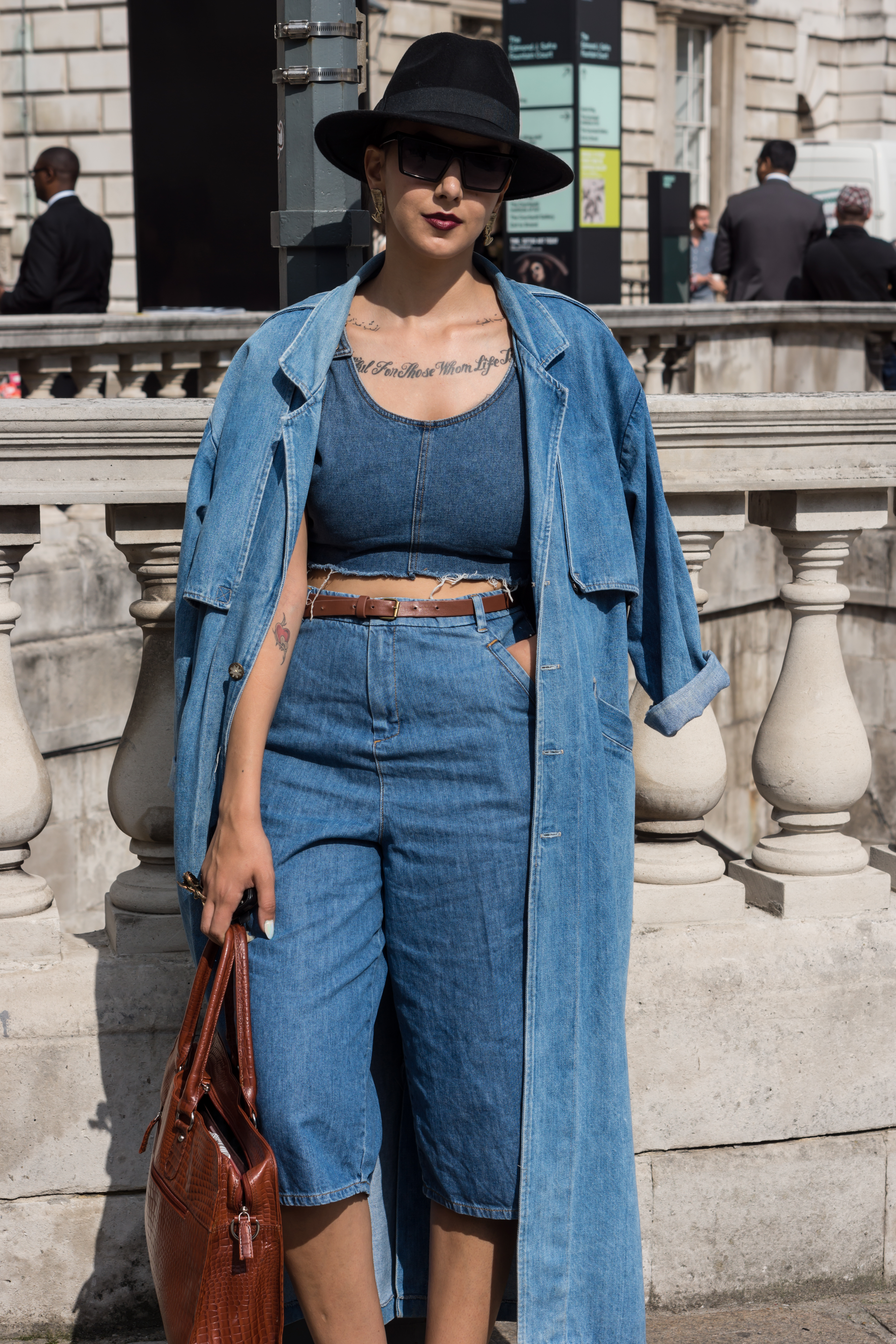 I’m not a fan of the double denim trend at all, but this outfit at London Fashion Week caught my attention and made me think: if you can pull it off then who am I to say otherwise? It’s actually a TRIPLE denim ensemble and I think its was wise to team this the neutral black hat and brown belt. The fab 90’s lip colour really pulls it together.