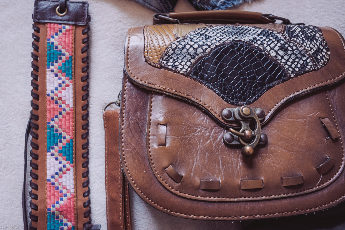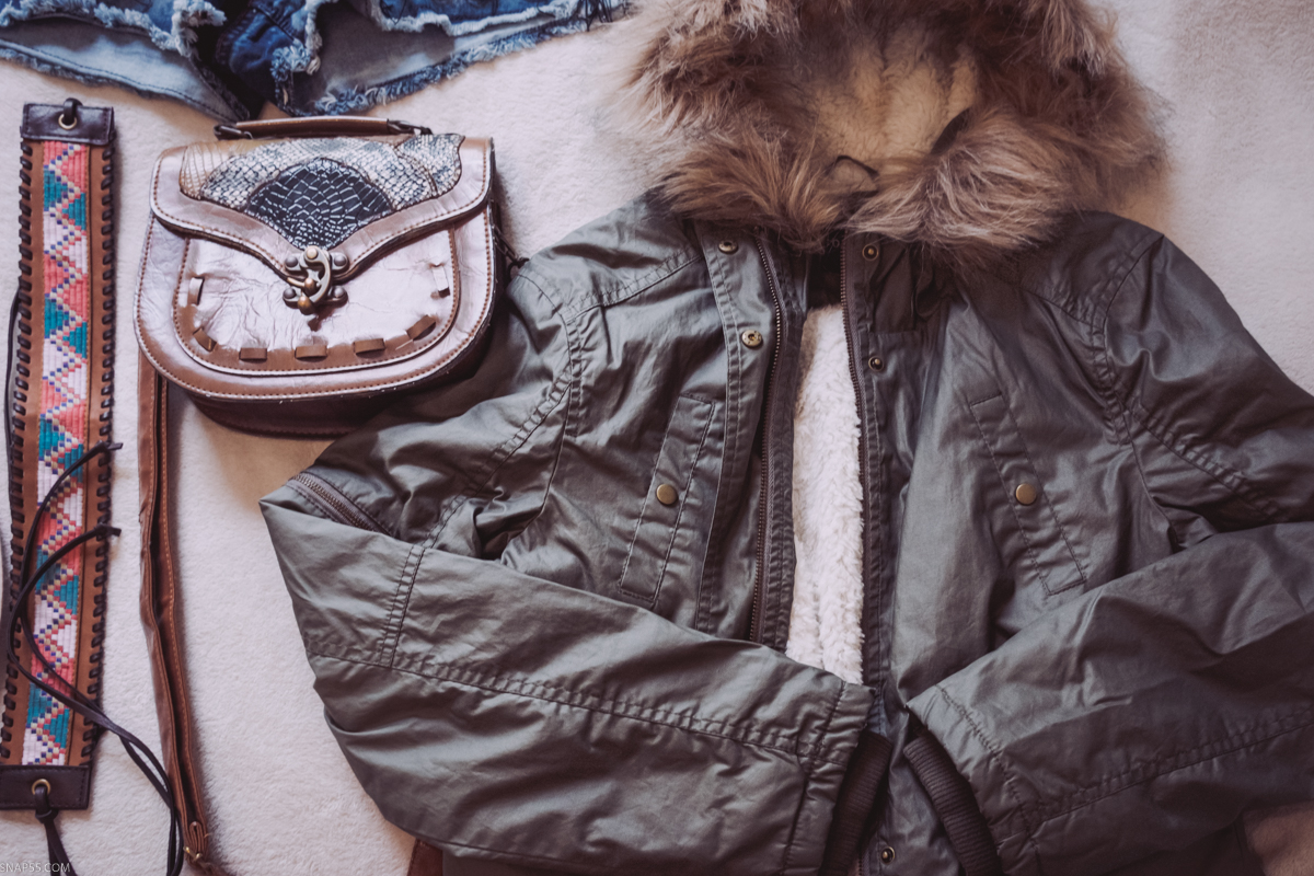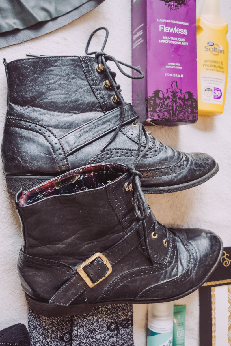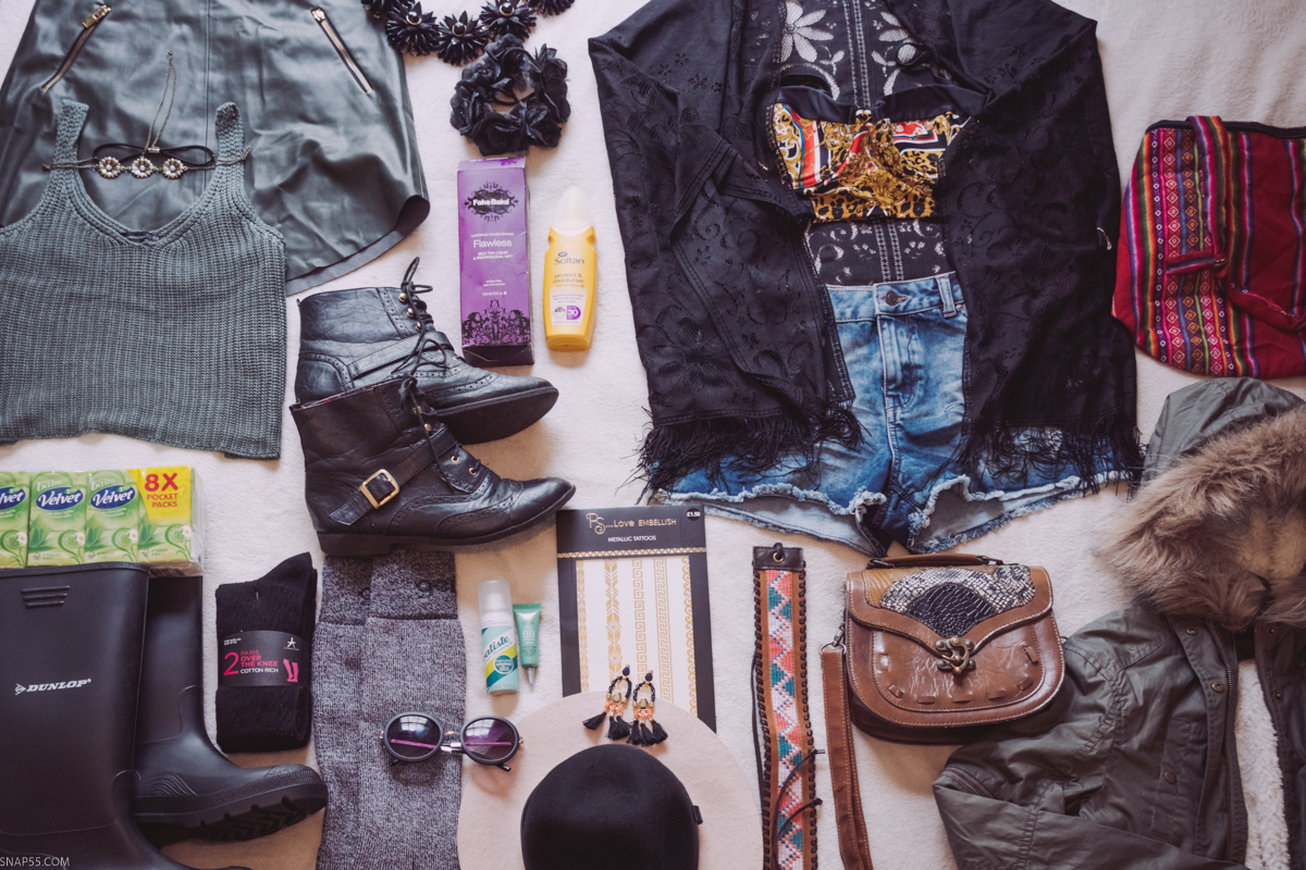 In this image from top left across: Khaki leather skirt, Zara / ASOS Metal Daisy Hair Crown – Gold, ASOS / Black flower necklace, New Look / Black rose headband, Primark / Black tassel kimono, Primark / Bikini top, ASOS / Bag – a gift from Nepal / Khaki knit crop top, Primark / Boots, Primark / Fake Bake fake tan / Soltan sunscreen / Denim hot pants, New Look / Tissues / Dunlop wellington boots, Sports Direct / Black wellington socks, Primark / Grey wellington socks, Sports Direct / Sunglasses, Primark / Batiste dry shampoo / Ginvera BB Cream / Gold temporary tattoos, Primark / Hat, H&M / Tassel earrings, Primark / Woven belt, Primark / Bag, vintage / Khaki waxed parka, Oasis via ASOS.