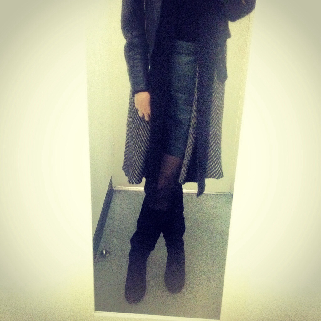 Simple black long sleeved top from Uniqlo, Primark extra long open cardigan, vintage leather biker jacket Zara leather look mini in forrest green, Primark suede look boots.
